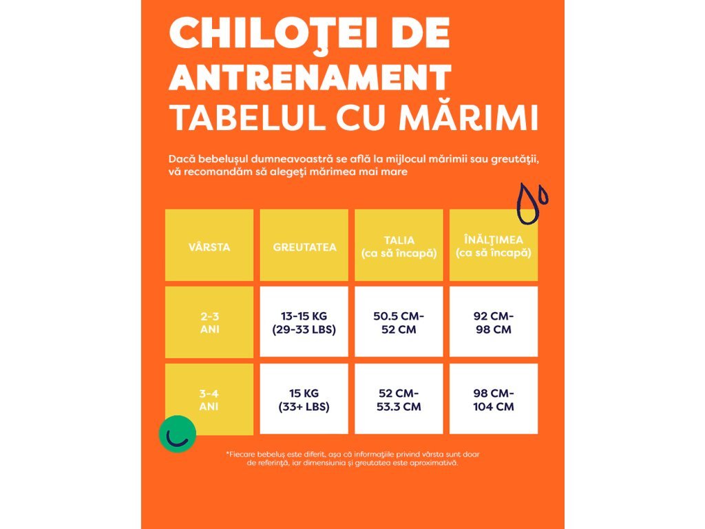 Setul cu trei bucăți de chiloței de antrenament ușurează trecerea de la scutece la chiloței în mod avantajos. Spre deosebire de scutece, chiloțeii se îmbracă în loc să fie schimbați, astfel că copilul dumneavoastră se poate simți ca un băiat sau o fată mare. Set cu preț avantajos.