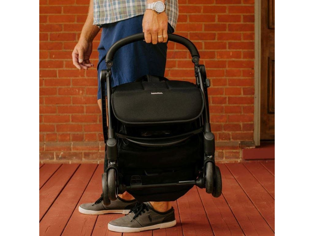 Căruciorul Hamilton are caracteristici care asigură confort, comoditate și siguranță optimizate. Aceste caracteristici includ un spătar rabatabil, mânere din piele și un mâner în fața copilului, un sistem de ham de siguranță în 5 puncte, un suport pentru picioare reglabil, un coș de depozitare spațios.
