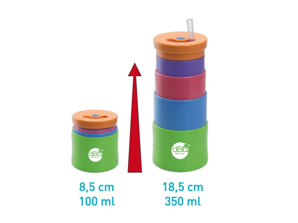 Cana telescopică poate fi setată de la 8,5 cm la 18,5 cm, resp. de la 100 ml la 350 ml. În interior, există un pai extras din silicon alimentar și un recipient din silicon. Piesele din silicon sunt detașabile (după deșurubarea părții superioare) și ușor de întreținut. Nu puneți în cuptorul cu microunde sau în mașina de spălat vase.