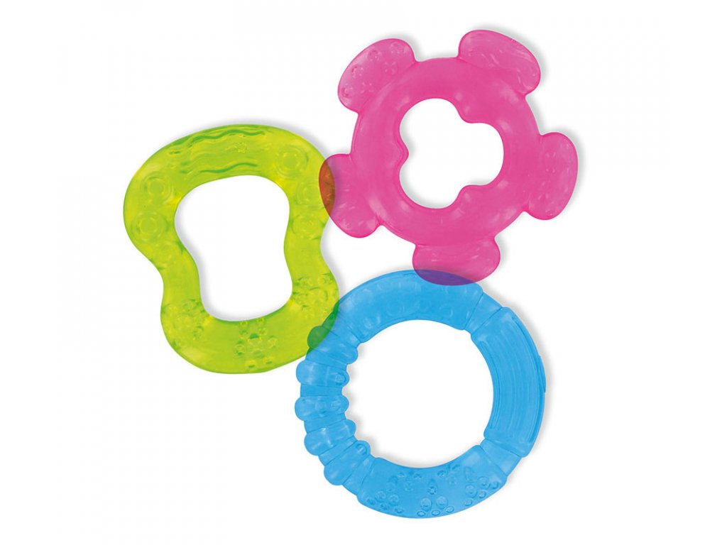 Fiecare jucărie de dentitie are o culoare si o formă diferită. Sunt transparente și apa distilată se mișcă înăuntru. Toate acestea vor atrage atentia bebelușului. Se pot răci in frigider (nu se baga in congelator) astfel incat să calmeze durerea la apariția dinților. Jucăriile sunt decorate pe tot perimetrul cu modele în relief, care stimulează nevoia de a mușca ceva și ajută la creșterea dinților.