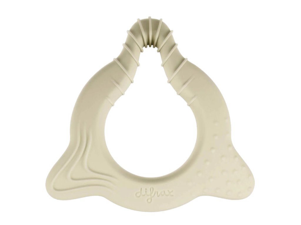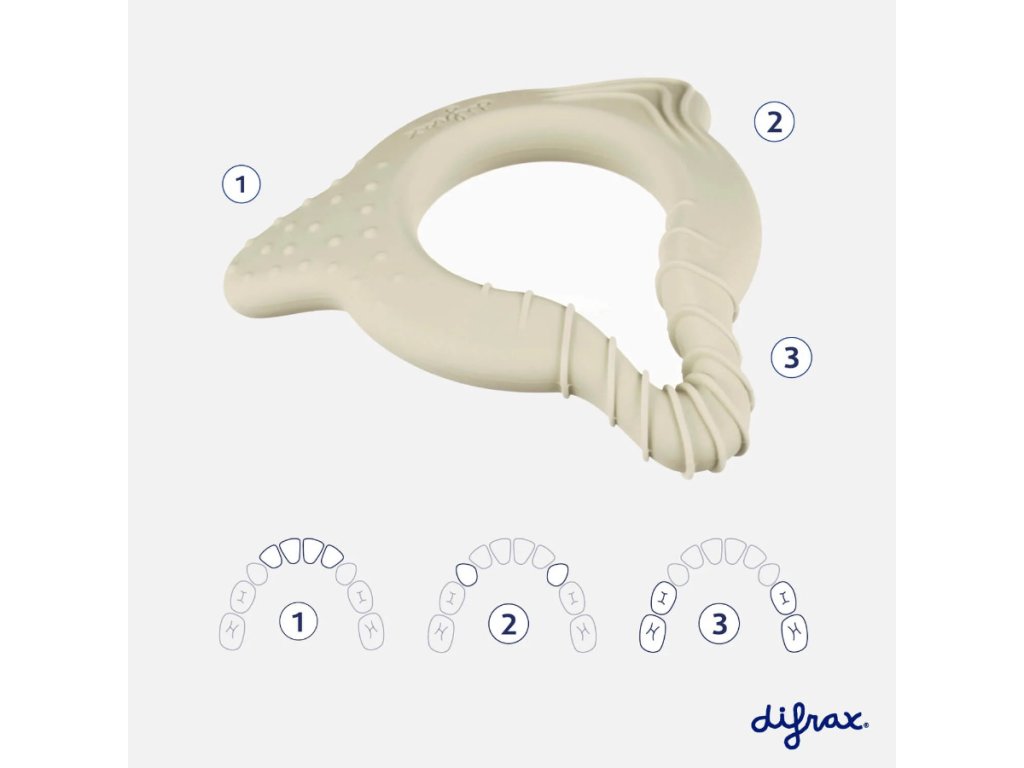 Difrax 3 în 1 Jucărie dentiție Popcorn ameliorează durerea în diferite stadii de creștere a dinților. Partea dentiției luată pentru stadiul 1 este pentru dinții din față, stadiul 2 este pentru dinții canini și stadiul 3 este pentru dinții molari. Dacă răciți dentiția în frigider va calma de asemenea și gingiile. Forma curbată și deschisă permite gingiilor sau dinților să se prindă mai ușor și stimulează abilitățile motorici fine ale mâinii. Dentiția 3 în 1 a fost dezvoltat în colaborare cu logopezi și este fabricat din silicon 100% moale și igienic.