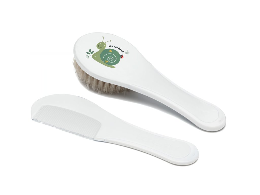 Un set practic pentru îngrijirea părului nou-născuților și bebelușilor. Spre deosebire de alte perii din silicon dur, peria de la bébé-jou are un păr natural moale care nu irită pielea delicată a capului bebelușului. Pieptenele are o formă ergonomică și datorită vârfurilor rotunjite ale dinților nu poate zgâria. Ușor de curățat prin spălare in apă călduță cu puțin săpun.