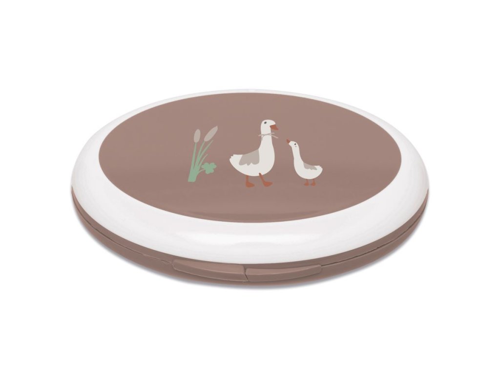 Manichiura conține forfecuță cu vărfuri rotunjite, pilă de unghi și unghieră. Toate sun confecționate din oțel inoxidabil fin. Cutiuța protejează de praf și ajută la menținerea manichiuri curate. Chiar și în acest caz curățați componentele cutiuței întodeauna înainte de utilizare și la nou-născuți dezinfectați cu alcol sanitar.