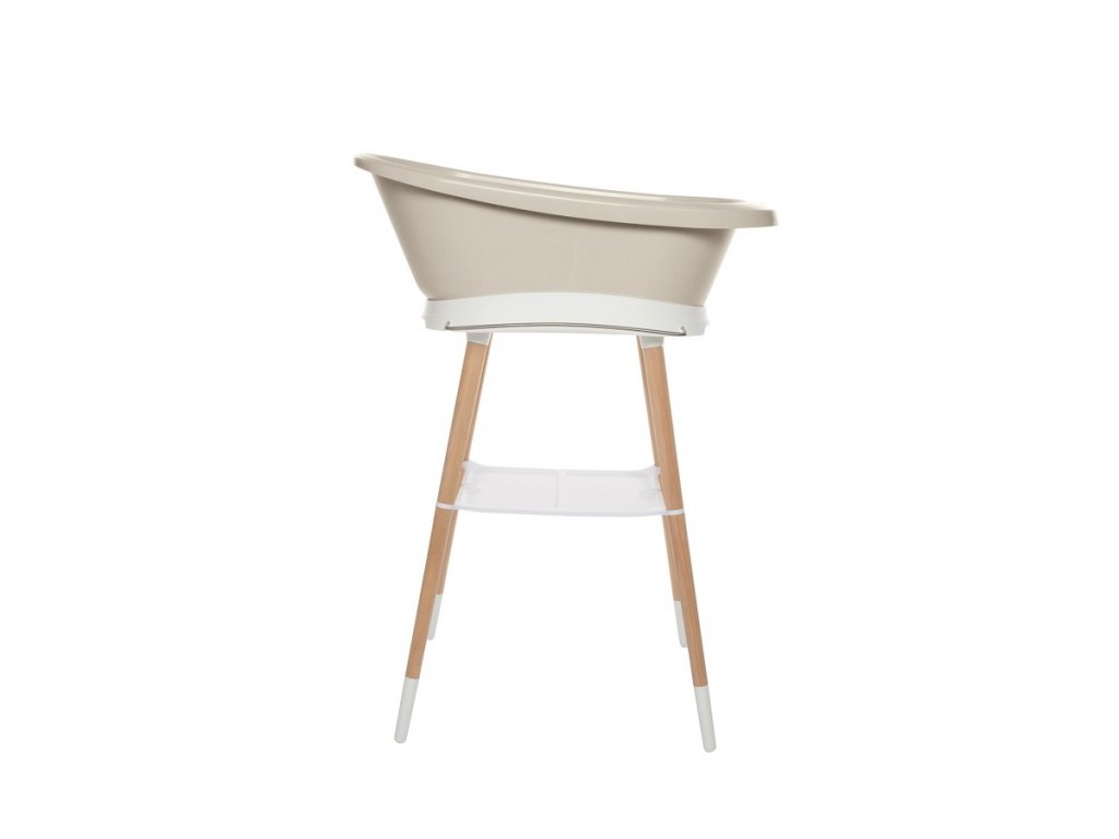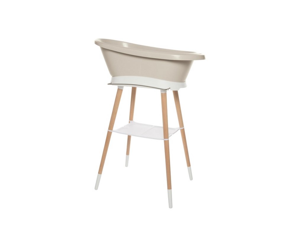 Suportul de baie Sense, foarte stabil, are picioare din lemn de fag lăcuit certificat FSC. Acest lucru îi oferă suportului un aspect modern și cald. Este dotat cu dispozitive practice; un suport pentru prosoape este atașat în partea din față. Raftul spațios din plastic oferă suficient spațiu pentru, de exemplu, șampon, lavetă, jucării de apă sau gel de baie. Acest lucru înseamnă că aveți la îndemână toate lucrurile necesare pentru a vă bucura în liniște de baie împreună cu cel mic. Un sistem de fixare inovator asigură că baia poate fi atașată cu ușurință la suport și la fel de ușor de îndepărtat. Cu un simplu clic, puteți face baie bebelușului dvs. fără a fi deranjat și în siguranță.